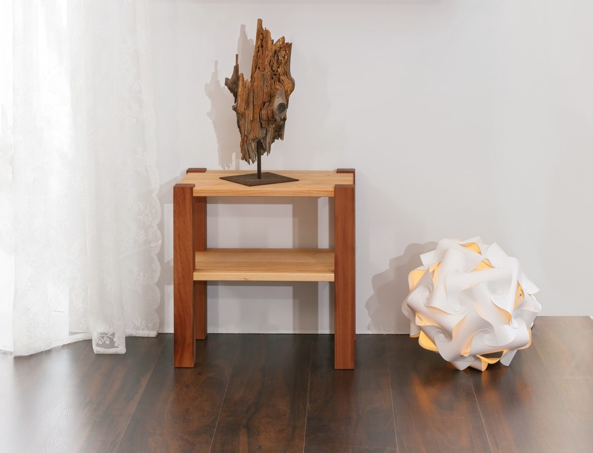 Nachtisch BeneVita mit 4 Füßen aus Platanenholz, Ablagen aus ErlenholzNachttisch mit 2 Seitenwänden BeneVita in massivem Erlenholz