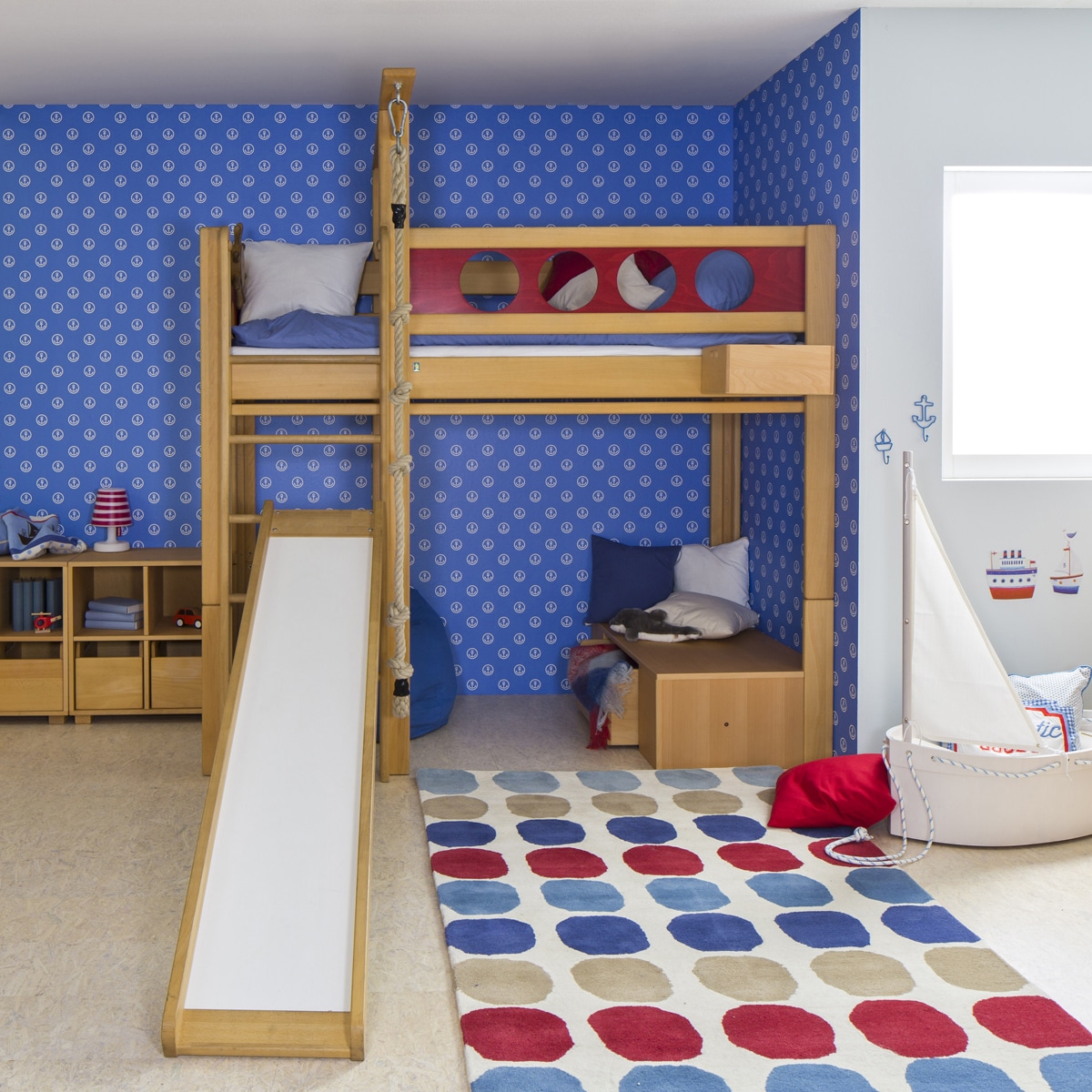Ein abenteuerliches Piratenhochbett für Seefahrer ab 4 Jahren. Mit Steuerrad, Kletterseil und der aushängbaren Rutsche. Hier einmal mit roten Bullaugenfüllungen vor einer blauen Tapete mit kleinen Ankermotiven. Natürlich gibt es auch ein Rutschbrett! Das kann in verschiedenen Neigungswinkeln direkt in die Leiter eingehängt werden.