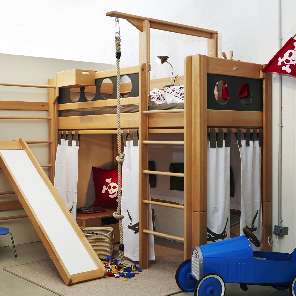 Ein Klassiker: Das Piratenhochbett mit Sprossenwand und Rutsche