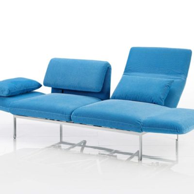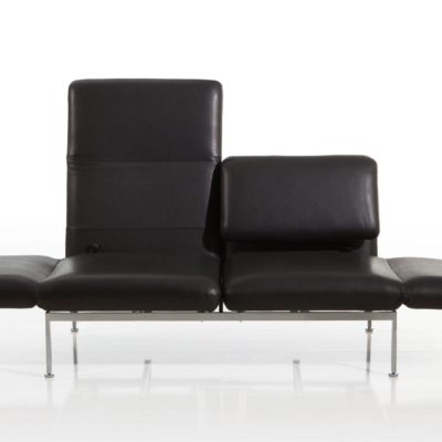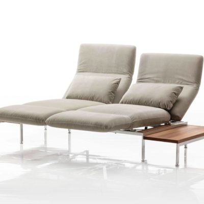roro-Elemente sind wahre Verwandlungskünstler. Die Drehsitze des Sofas lassen sich um 90 Grad vorschwenken, die Lehnen können aufgefaltet und bis zur Wunschposition abgesenkt werden. Die zwei Drehsitze von Roro-Small lassen sich auf diese Weise separat zu Longchairs vorschwenken – und noch weiter bis in die Position als Tagesliege. Zum Liegen und Schlafen sind die Sitze nämlich vollständig horizontal einstellbar.